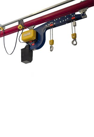 This kind of hoist is used in the automobile and printing industries among other applications. Two electrically and mechanically linked electric chain hoists with a total of four falls prevent undesirable rotation or tilting. This allows synchronized raising and lowering of large awkwardly shaped loads.